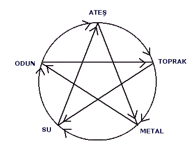 Yaratıcı Devre (Sheng, [Şeng] Devresi) süresince evrelerin etkileşimi doğal sıralamada gerçekleşir: Odun Ateş’i besler. Ateş Toprak’ı (kül) yaratır. Toprak Metal’I oluşturur (minerallerin damıtılması). Metal Su’yu yaratır (yoğunlaşma) ve Su da Odun’u besler. Bu devreye aynı zamanda “anne-oğul” devresi de denir.